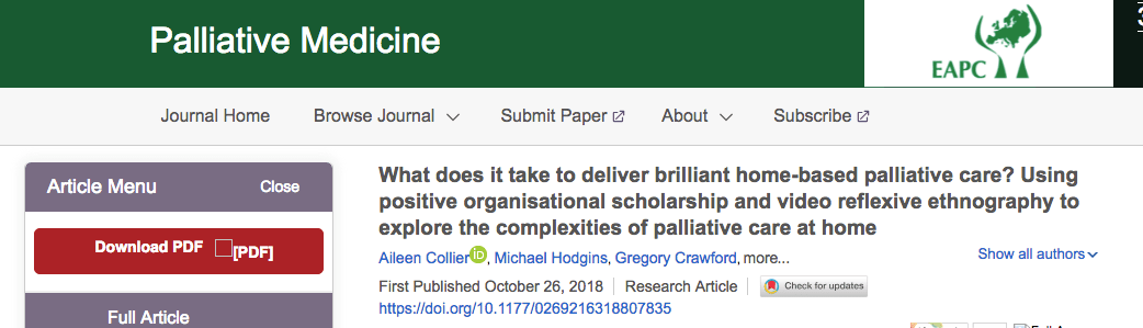 Congratulations to Dr Aileen Collier and Associate Professor Ann Dadich on their recent paper being selected as ‘Editor’s Choice’ in the January 2019 issue of Palliative Medicine. This short video will tell you more about the project.